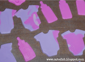 Since it was for a baby shower, I wanted to include something 'babyish' for the cupcakes, too.  So I used a technique I saw from IBakeCakes to make a quilted fabric look from fondant, to make a Hawaiian print I used for onsies and baby bottles.